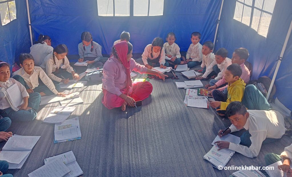 जाजरकोट भूकम्प प्रभावित क्षेत्रमा त्रिपालभित्र र खुल्ला चौरमै पढाइ